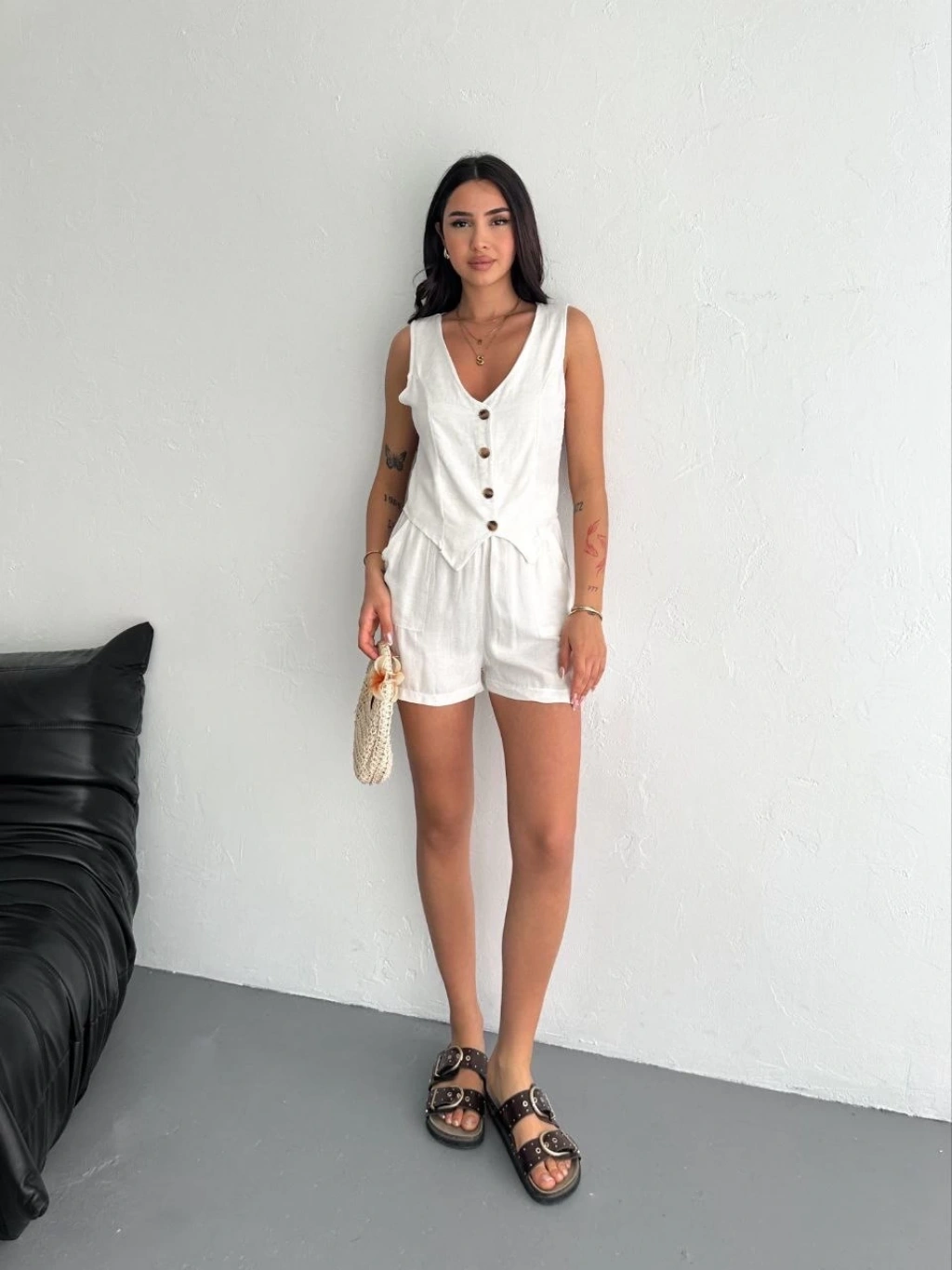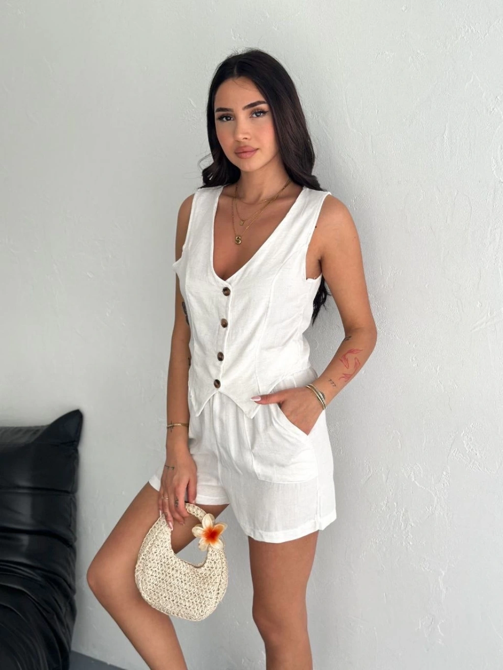 Keten yelek pantolon takım bej pt