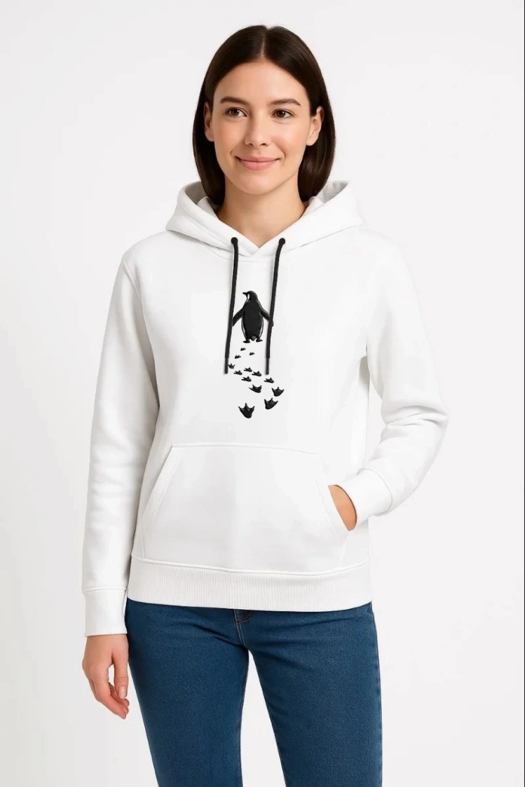 Kadın Oversize Hoodie - Sırt Baskılı "Survivor Penguin" Temalı, Felsefi Yazılı Kapüşonlu Sweatshirt - Beyaz