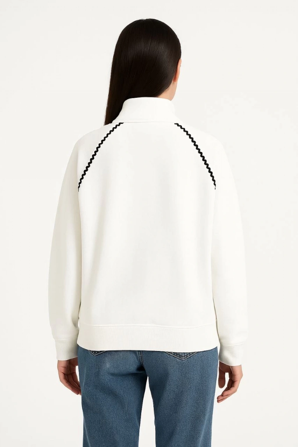 Kadın Oversize Dik Yaka Fermuarlı Sweatshirt - Zincir Nakışli Kanguru Cepli, - Siyah