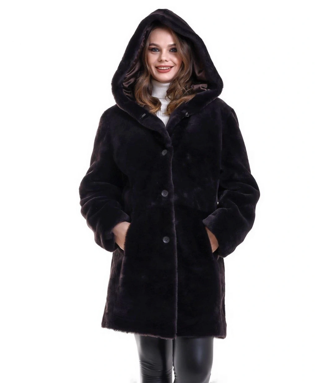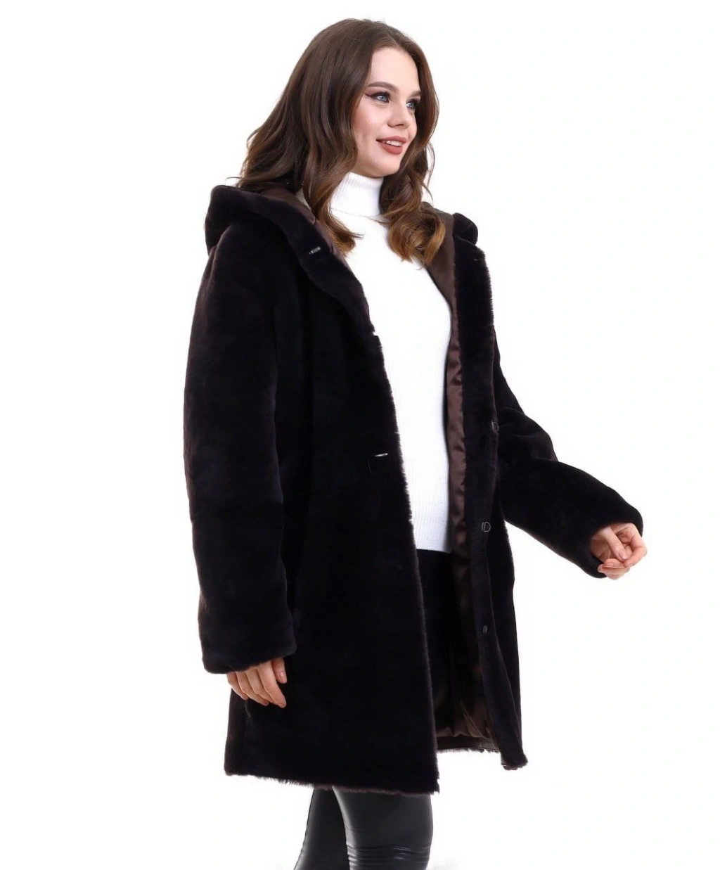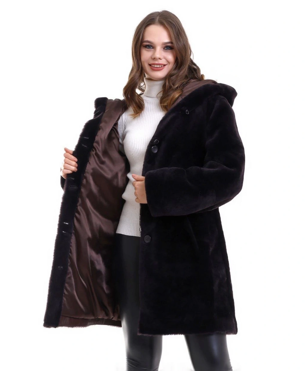 Kadın Uzun Kollu Yakalı Hakiki Kürk - Kahve