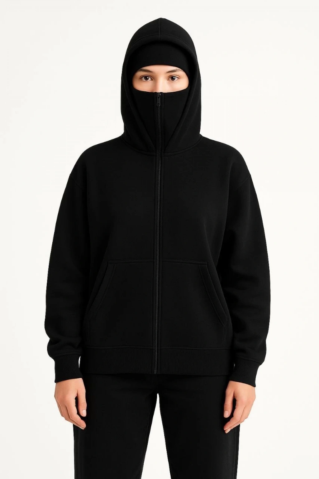 Kadın Samuray Ninja Çift Kapüşonlu Maske Detaylı Fermuarlı Kanguru Cepli Hoodie - Beyaz