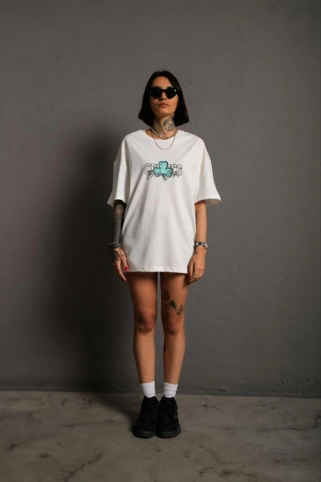 AICG Ön Arka Baskılı Bisiklet Yaka Kadın Oversize Bisiklet Yaka T-shirt - Beyaz