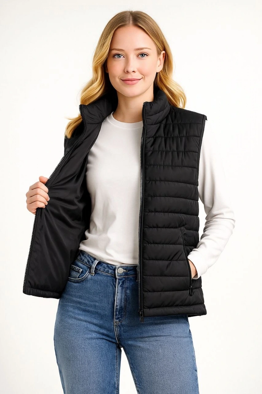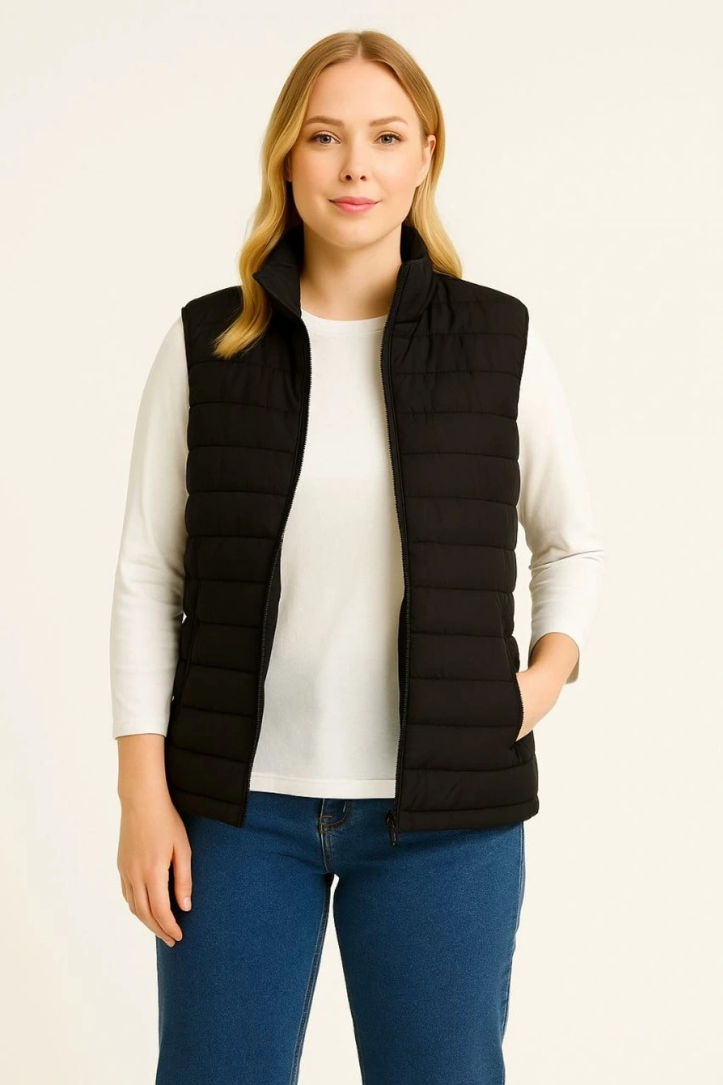 Kadın Şişme Fermuarlı Yelek Su itici Kapitone Astarlı Kumaş Cepli Hafif Kışlık Spor Rahat Kalıp - Bej