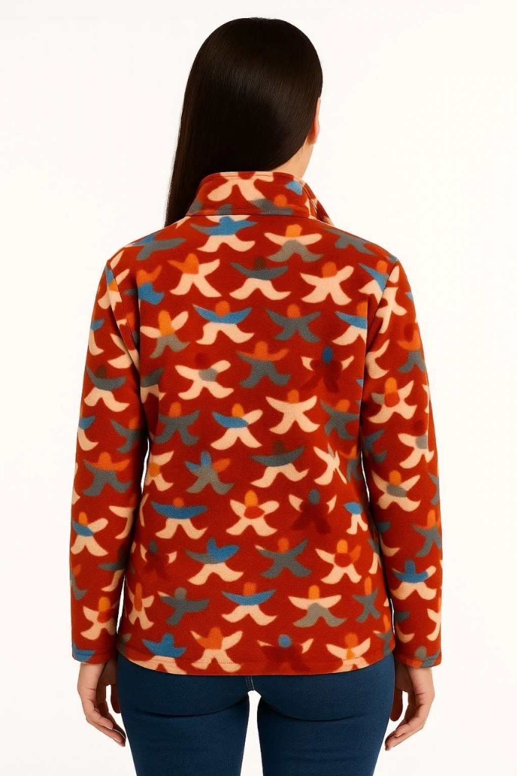 Kadın Tam Fermuarlı Desenli Polar Sweat – Siyah Multicolor Figür Desen Yakalı, Uzun Kollu, Oversize Rahat Kalıp - Siyah