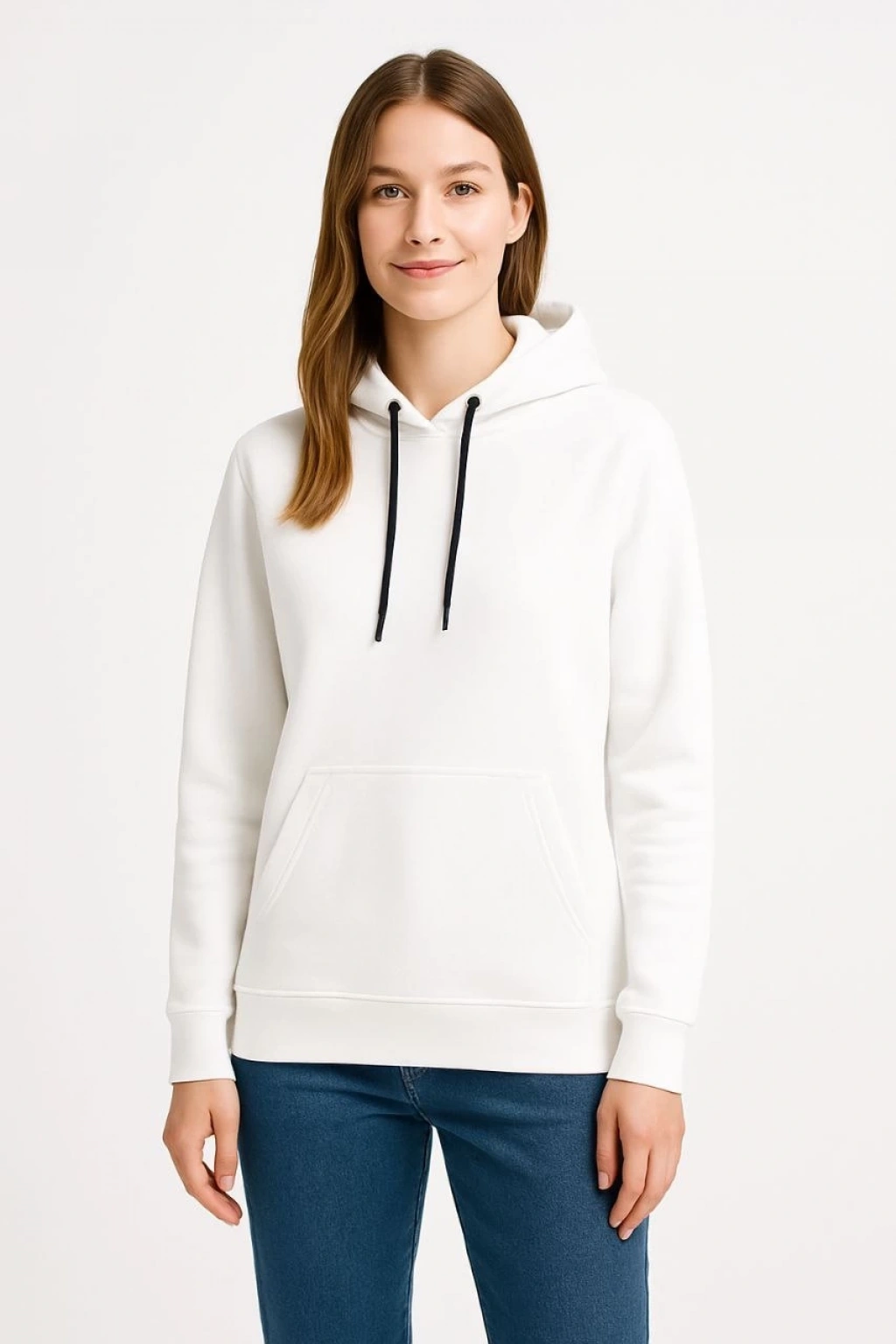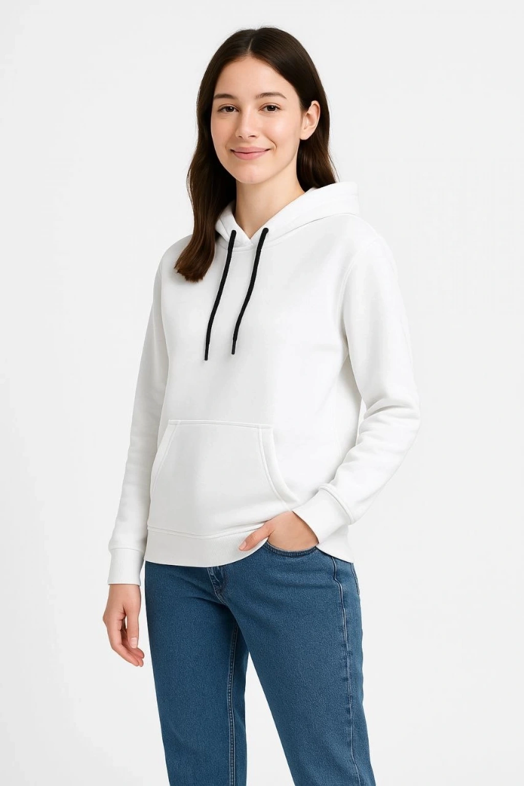 Kadın Kapüşonlu Üç İplik Sweatshirt – Beyaz Strong Heykel Baskılı, Rahat Kalıp, Kanguru Cepli Modern Tasarım