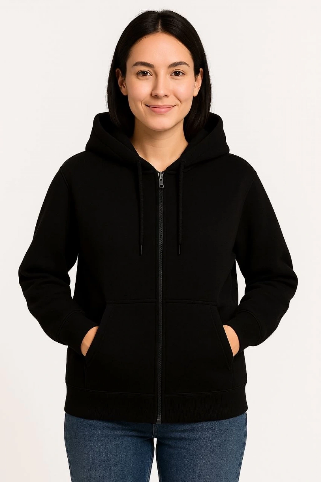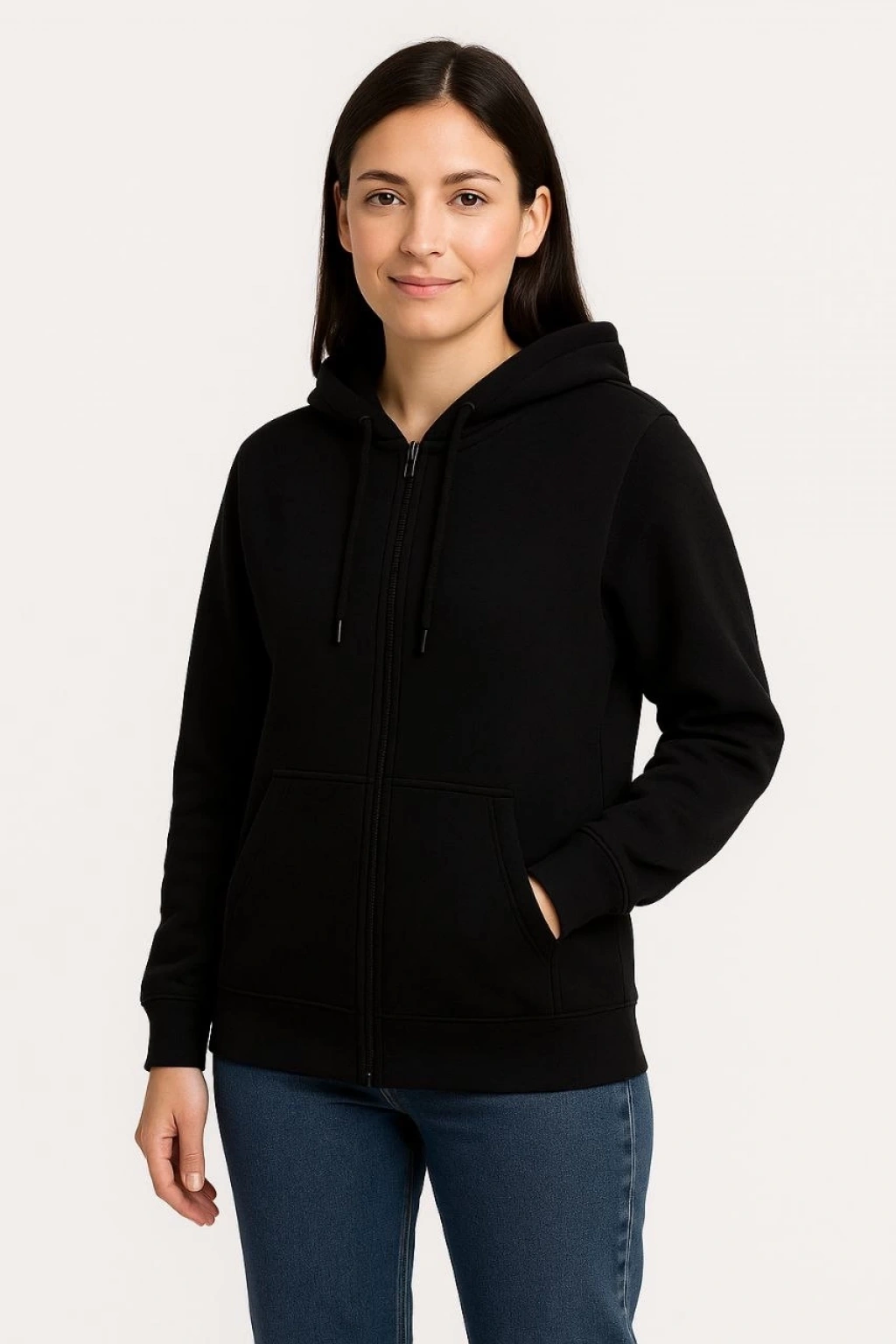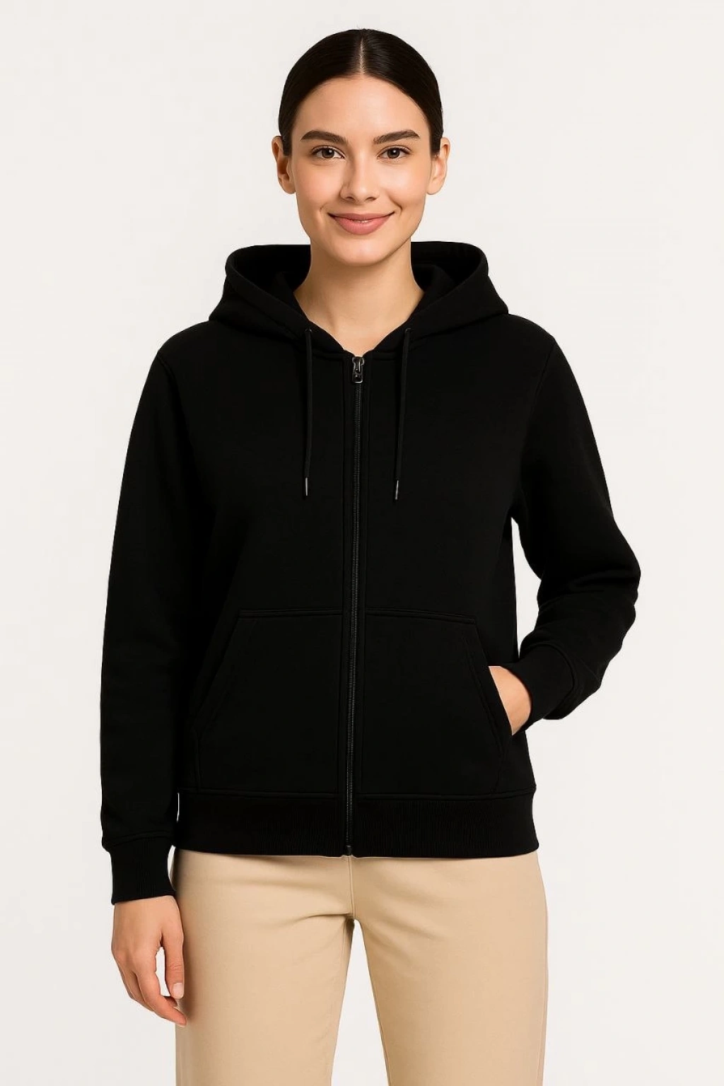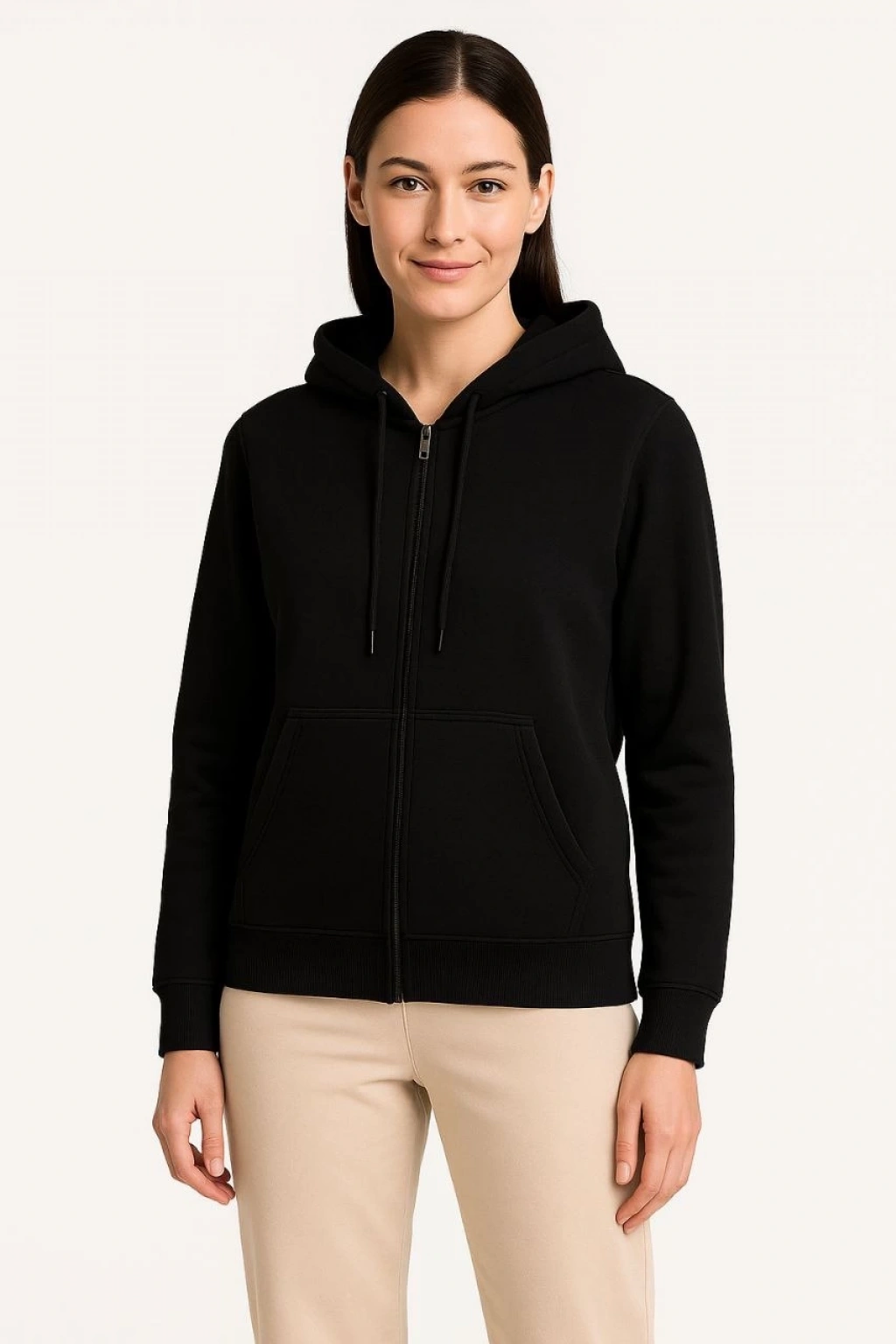 Kadın Üç İplik Kapüşonlu Tam Fermuarlı Kanguru Çepli SweatShirt Hoodie - Beyaz