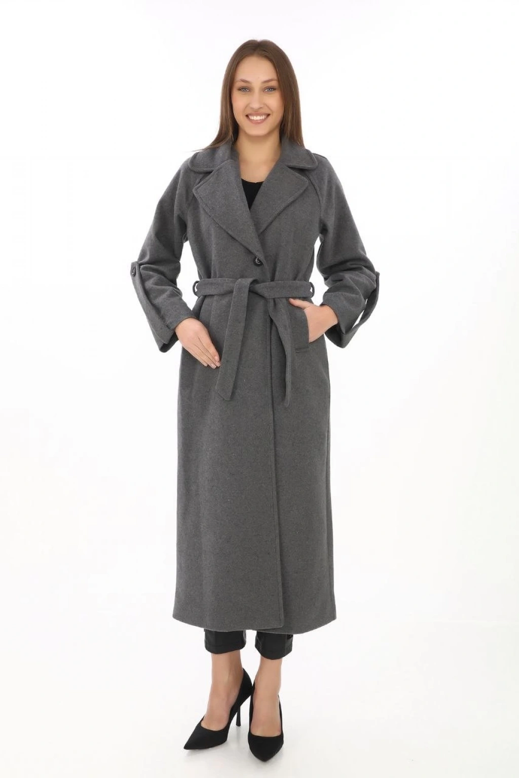 Kadın Uzun Kaşe Kaban – Yünlü Dokuma Kaşmir Kumaş, Kruvaze Yaka, Kuşaklı Astarlı Tesettür Uyumlu Şık Kışlık Siyah Model - Füme