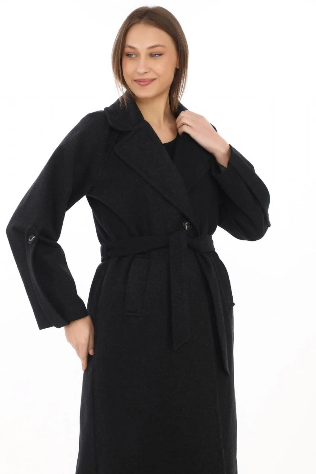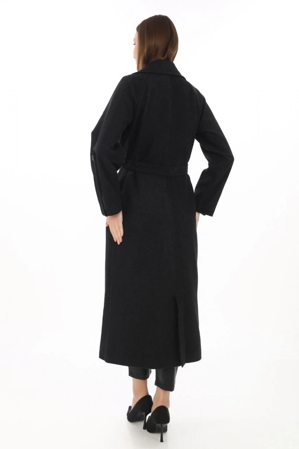 Kadın Uzun Kaşe Kaban – Yünlü Dokuma Kaşmir Kumaş, Kruvaze Yaka, Kuşaklı Astarlı Tesettür Uyumlu Şık Kışlık Siyah Model - Siyah