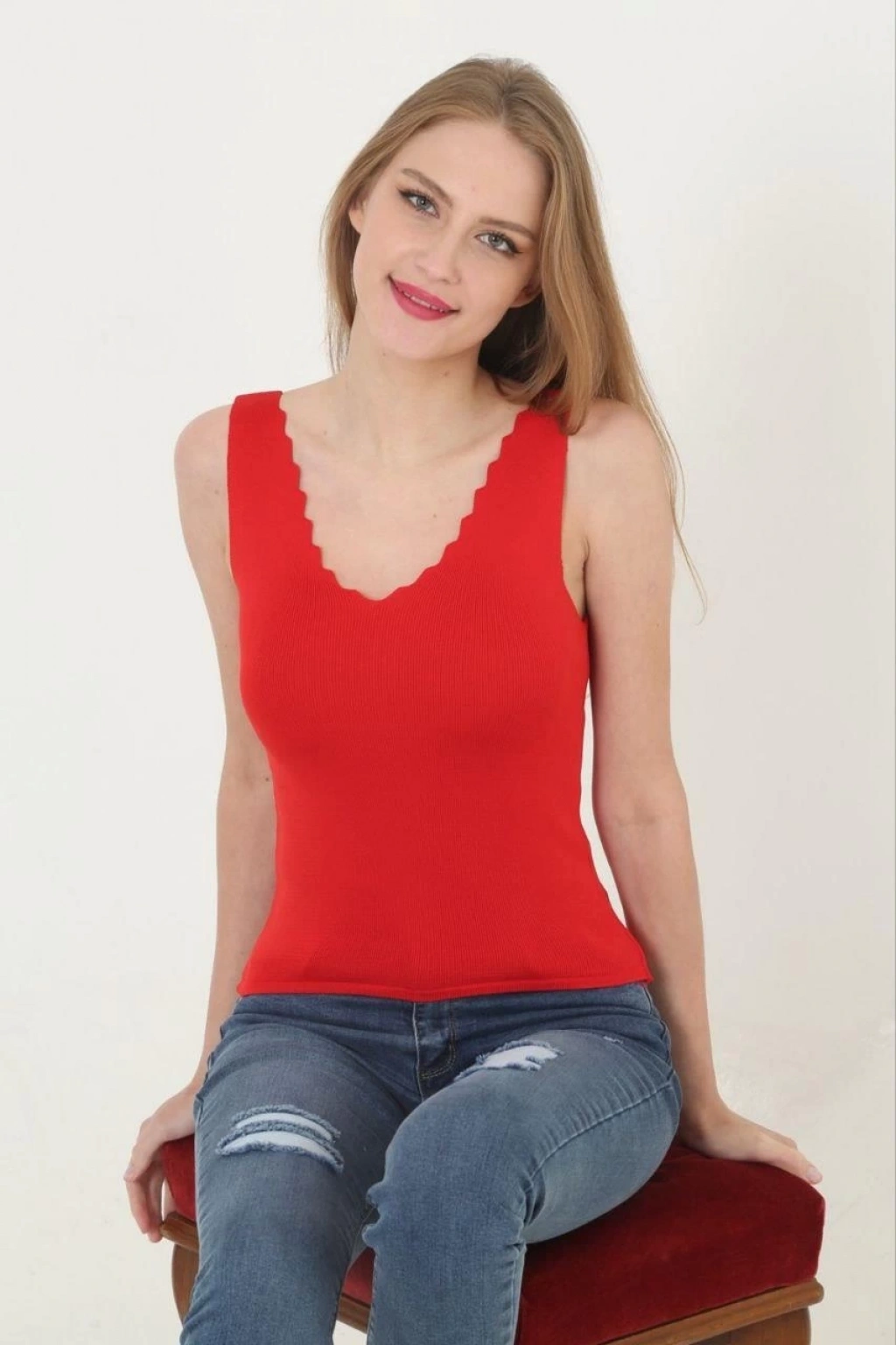 Kadın V Yaka Fırfır Detay Crop - Kırmızı