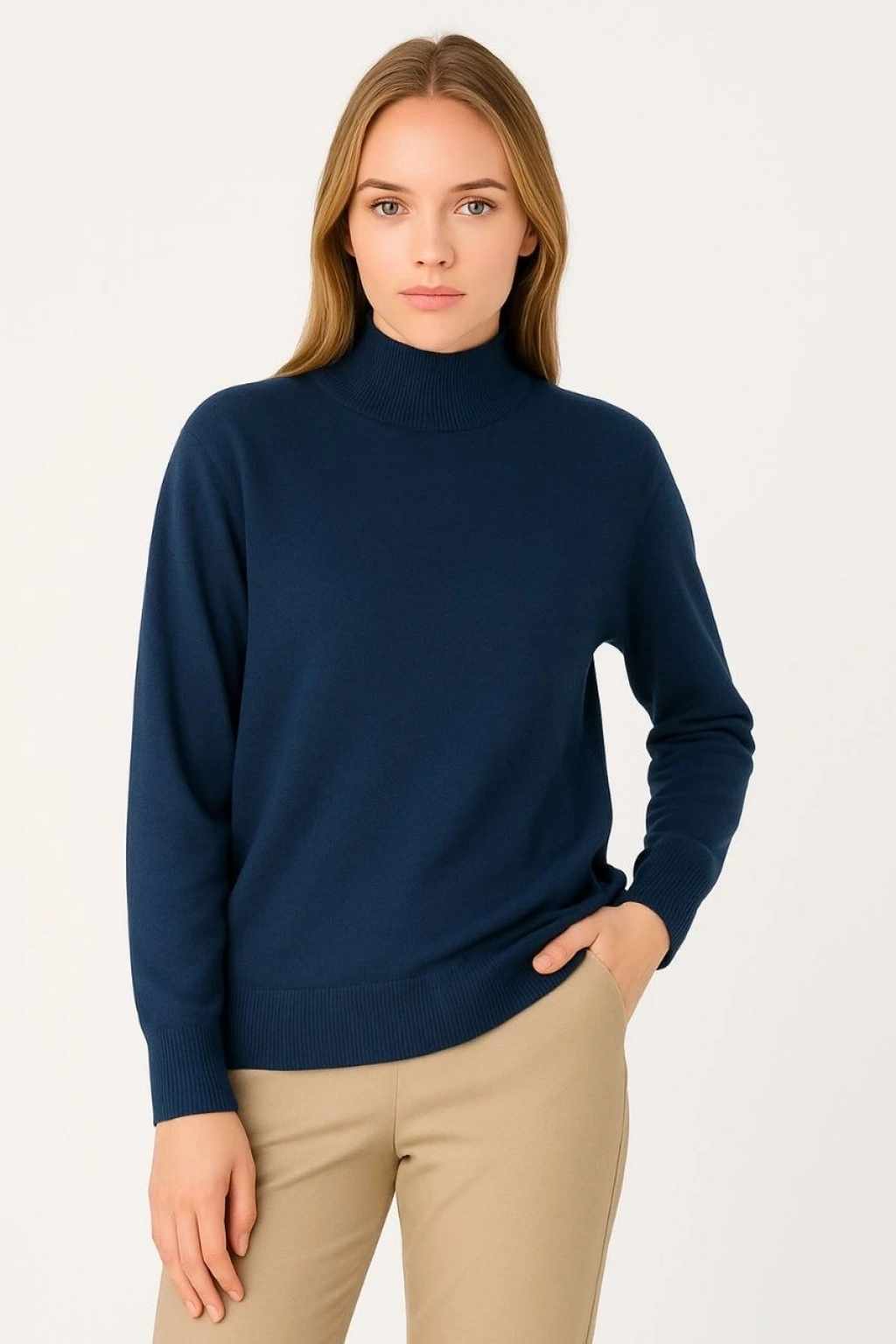 Kadın Yarım Boğaz Triko Kazak yumuşak dokulu Pamuklu ince Dokuma, uzun kollu Rahat Regular kalıp - İndigo