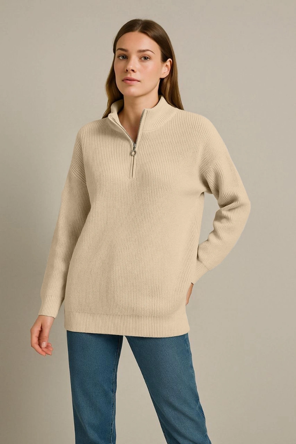 KADIN YARIM FERMUARLI TRİKO KAZAK – SELANİK ÖRGÜ, DİK YAKA, PAMUKLU DOKUMA, OVERSİZE UZUN KOLLU KIŞLIK MODEL - HAKİ