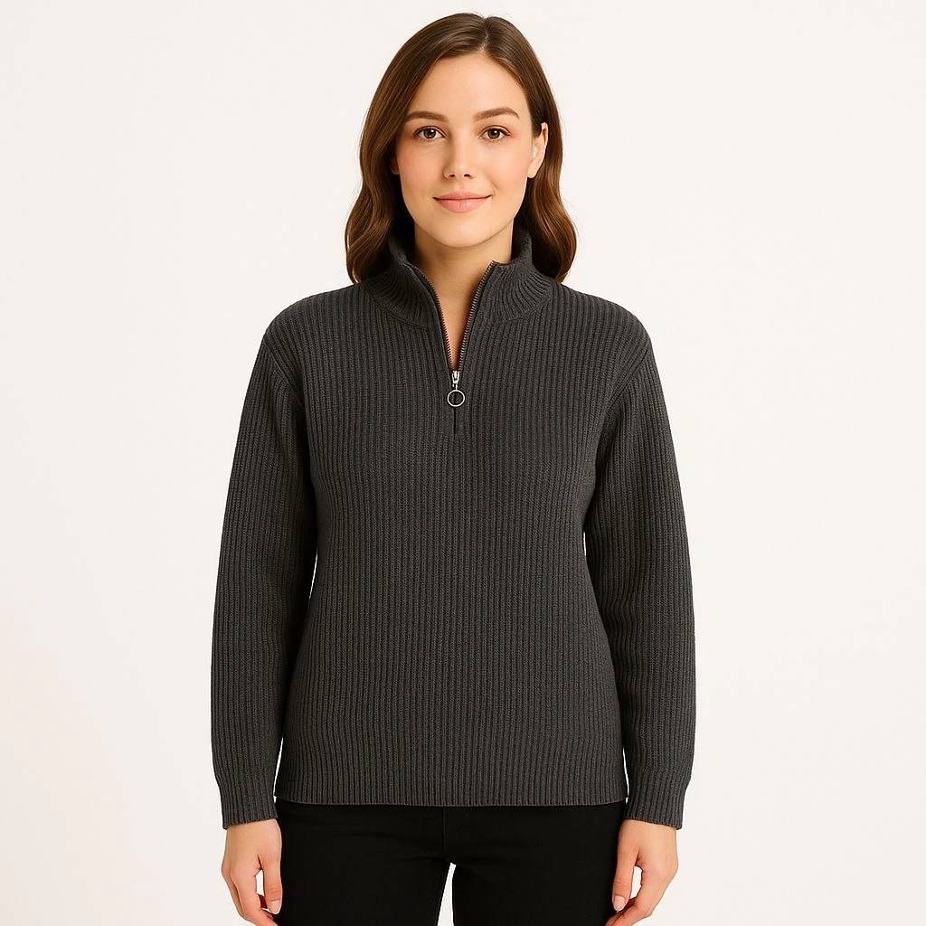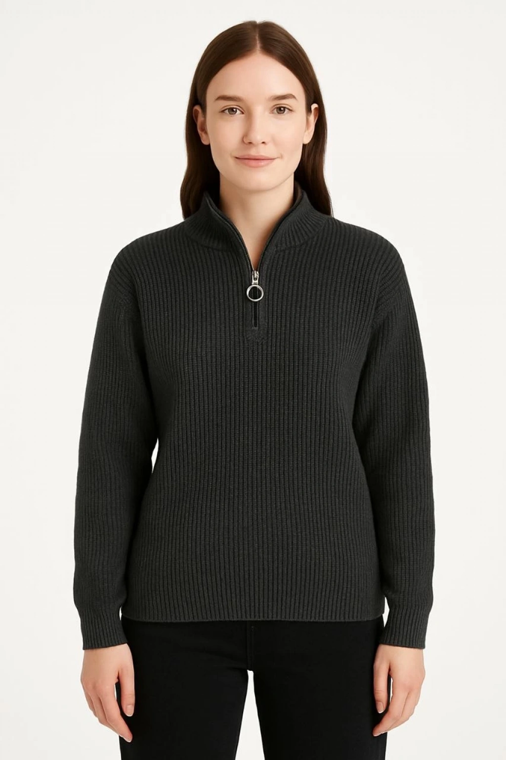 KADIN YARIM FERMUARLI TRİKO KAZAK – SELANİK ÖRGÜ, DİK YAKA, PAMUKLU DOKUMA, REGULAR FİT UZUN KOLLU KIŞLIK MODEL - GRİ