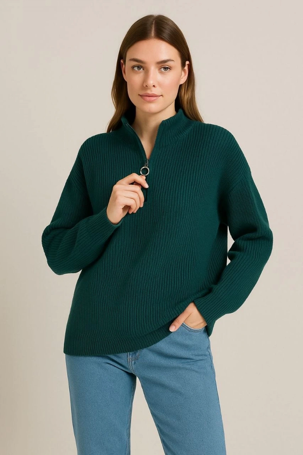 KADIN YARIM FERMUARLI TRİKO KAZAK – SELANİK ÖRGÜ, DİK YAKA, PAMUKLU DOKUMA, OVERSİZE UZUN KOLLU KIŞLIK MODEL - MİNT YEŞİLİ