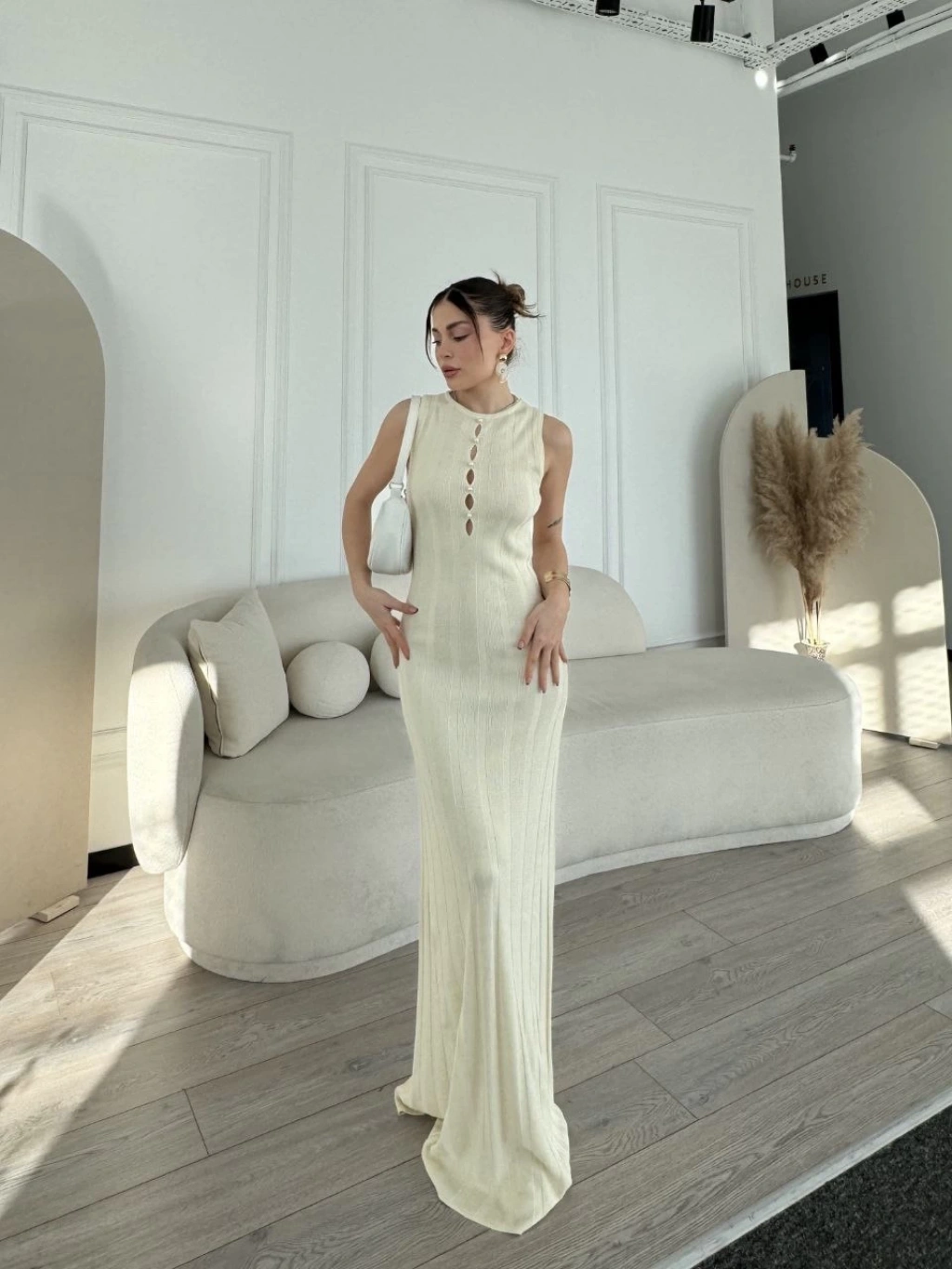 Kalın Fitilli Uzun Triko Elbise - Kırık Beyaz