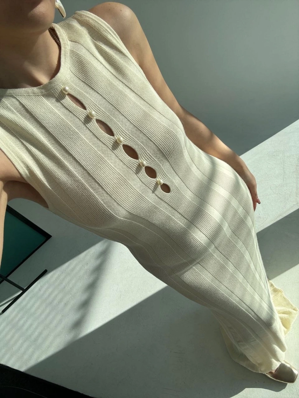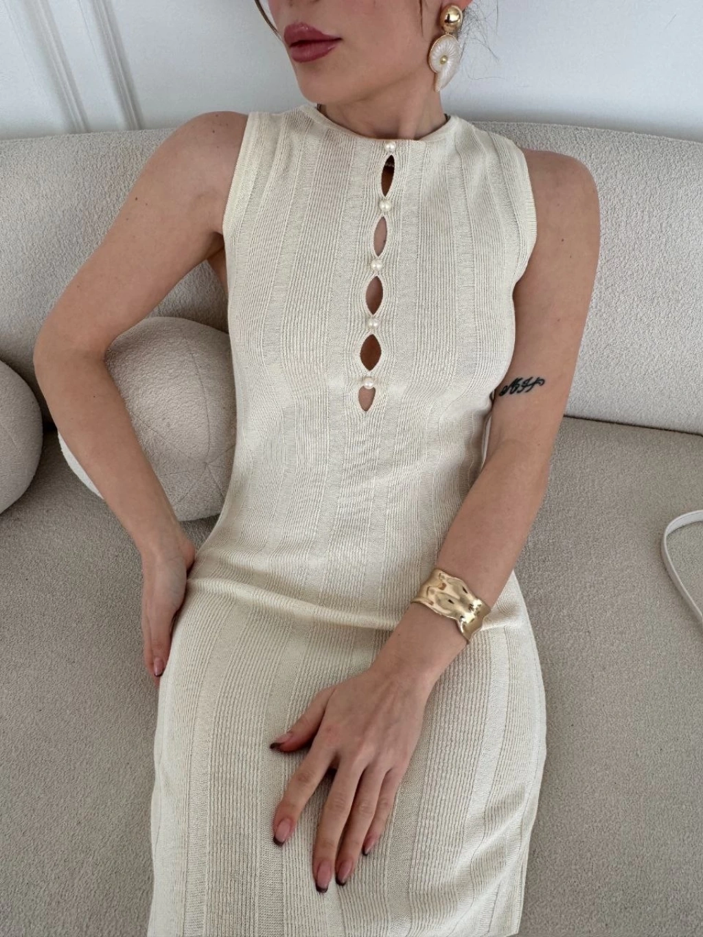 Kadın Boğazlı Uzun Fitilli Triko Dokuma Elbise - Beyaz