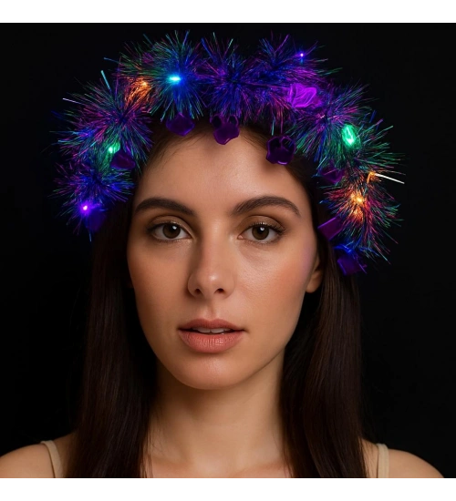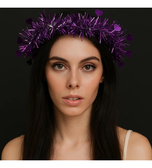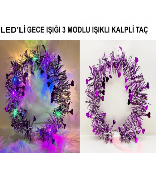 Kalp Püsküllü Gece Parıltısı 3 Modlu LED li Işıklı Taç Mor Renk