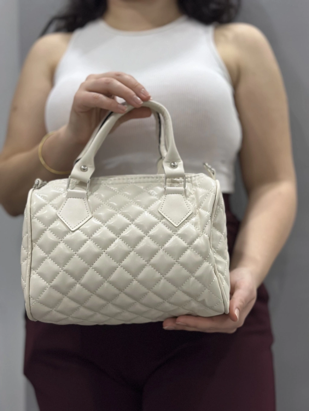 Kapaksız kapitone krem cilt çanta