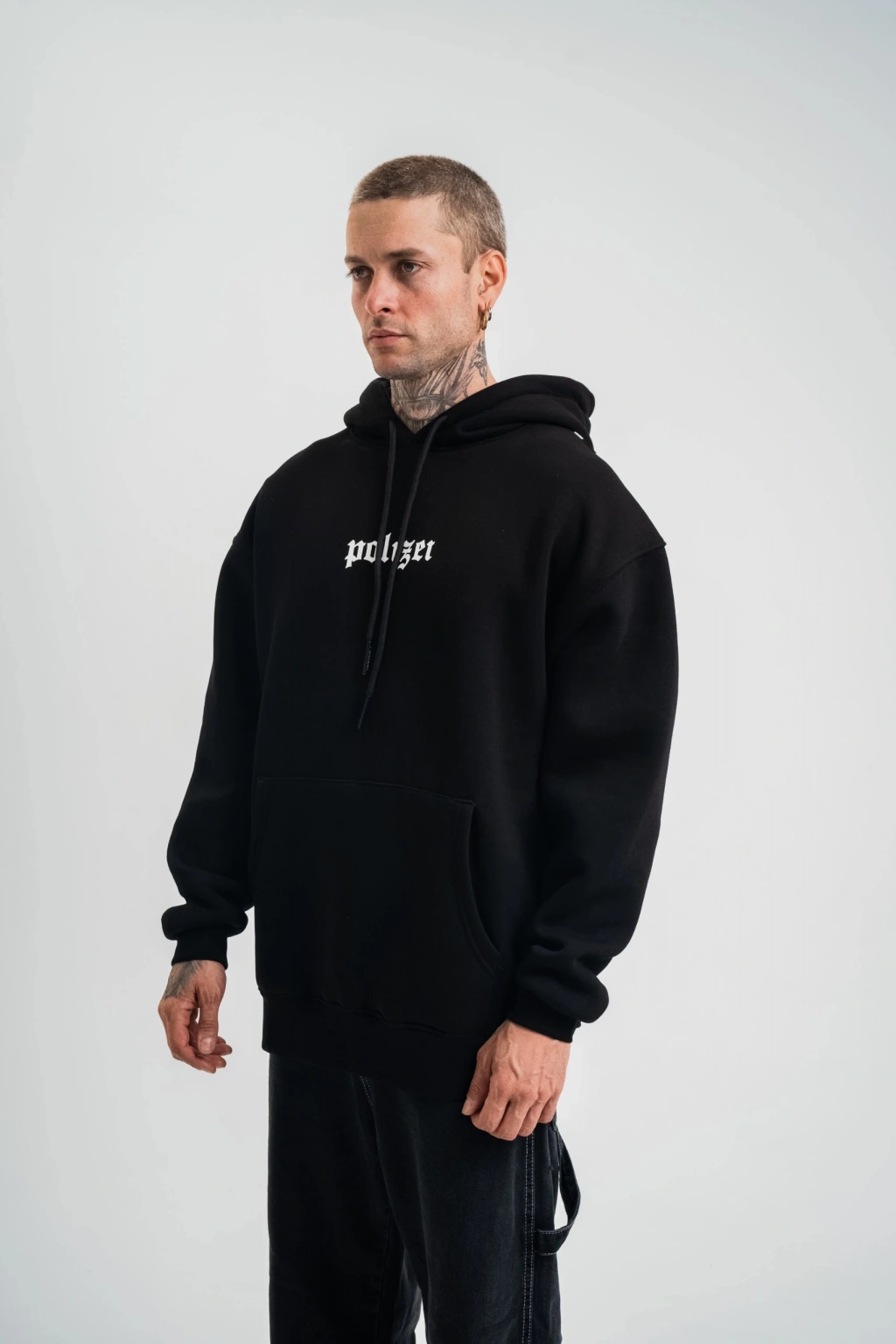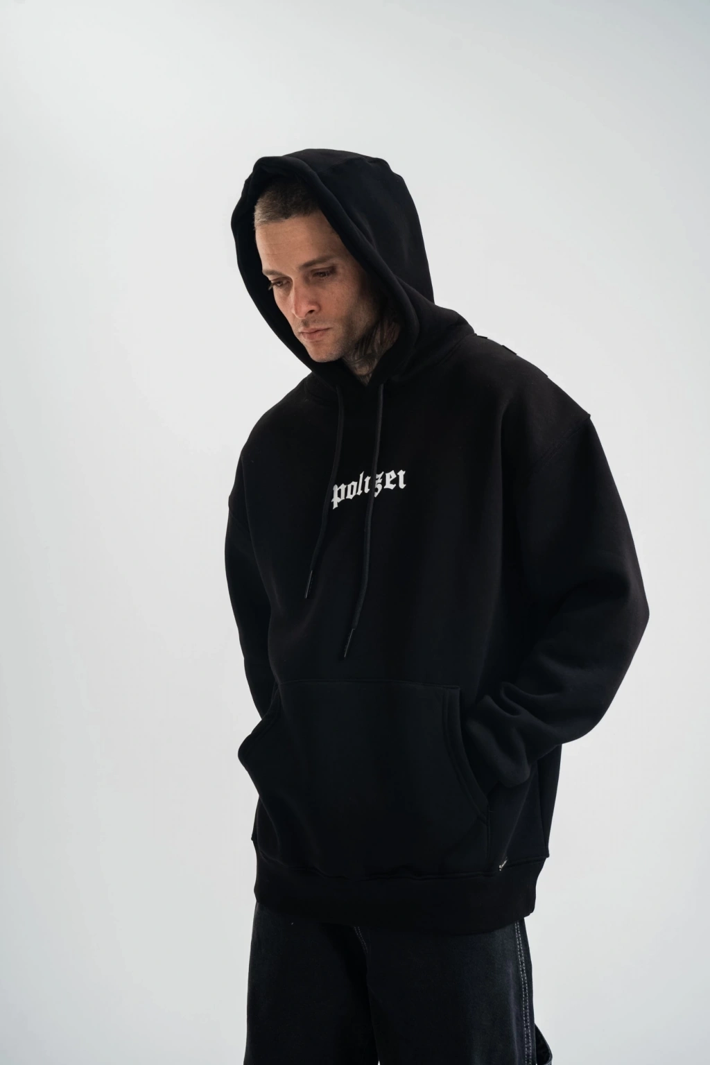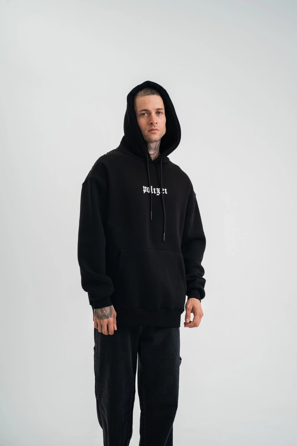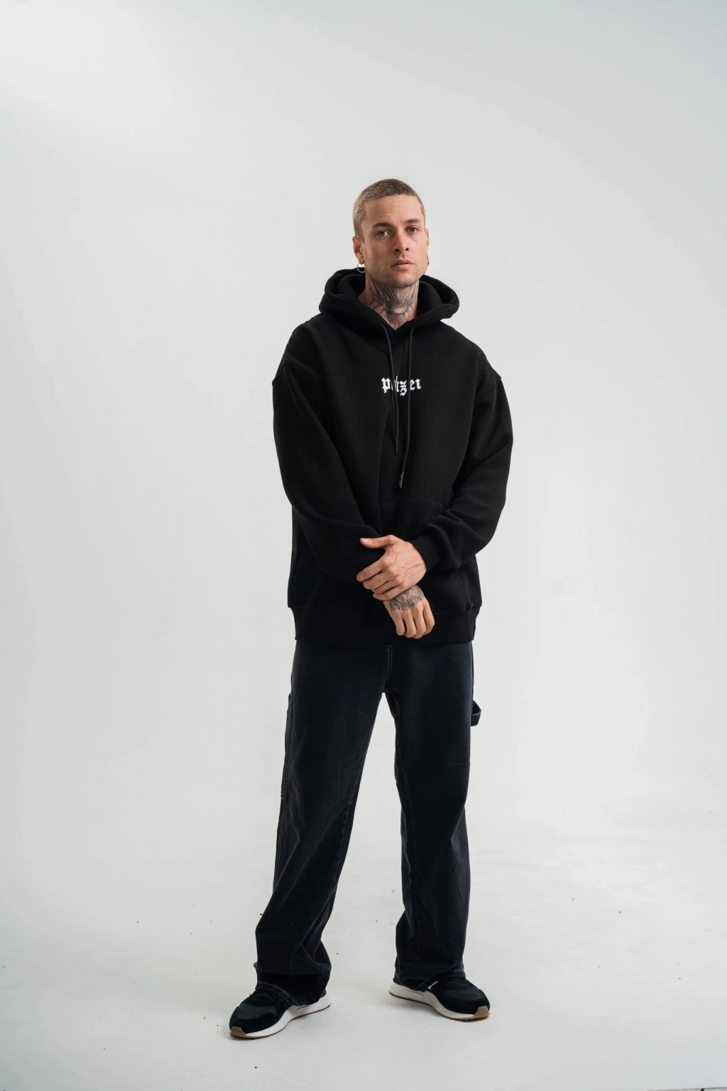 Erkek Oversize Üç İplik Kapüşonlu Sweatshirt – Siyah Sırt ve Ön Baskılı, Kanguru Cepli, Rahat Kalıp, İçi Pamuklu ModeL-Siyah