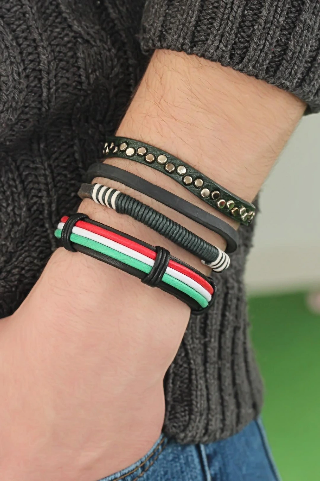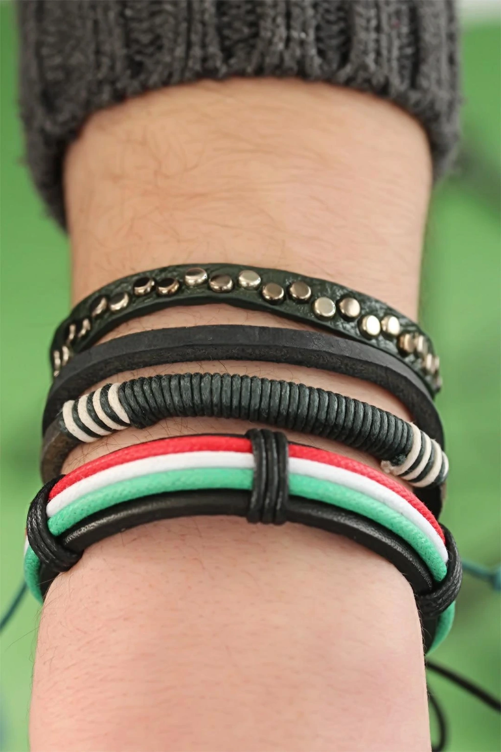 Karışık Renkli Çoklu Deri Erkek Bileklik Kombin
