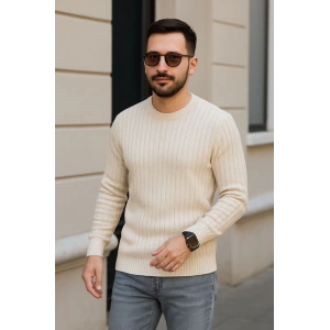 Erkek Bisiklet Yuvarlak Yaka Triko Kazak Pamuklu Kalın Fitilli Dokuma, Regular Fit Uzun Kollu Kışlık Model - Bej
