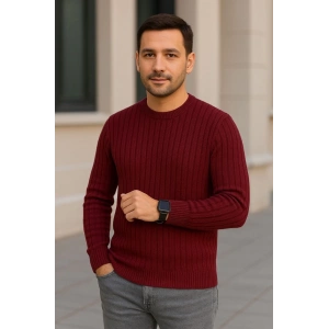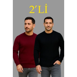 Erkek Fitilli Triko Kazak 2’li Set – Siyah & Bordo, Kalın Dokuma Pamuklu Regular Fit Bisiklet Yaka Uzun Kollu Rahat Kışlık Kazak Kombini