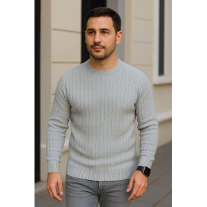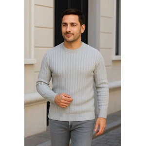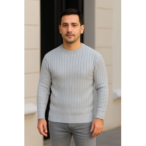 Erkek Bisiklet Yuvarlak Yaka Triko Kazak Pamuklu Kalın Fitilli Dokuma, Regular Fit Uzun Kollu Kışlık Model - Gri