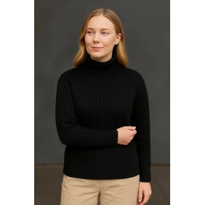 KADIN BALIKCI YAKA BAĞAZLI TRİKO KAZAK PAMUKLU KALIN FİTİLLİ DOKUMA - SİYAH