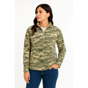 KADIN YARIM FERMUARLI DESENLİ POLAR SWEAT – HAKİ KAMUFLAJ YAKALI, UZUN KOLLU, OVERSİZE RAHAT KALIP - HAKİ