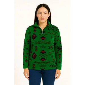 KADIN YARIM FERMUARLI DESENLİ POLAR SWEAT TRİBAL ETNİK DESEN YAKALI, UZUN KOLLU, OVERSİZE RAHAT KALIP - YEŞİL