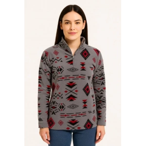 KADIN YARIM FERMUARLI DESENLİ POLAR SWEAT TRİBAL ETNİK DESEN YAKALI, UZUN KOLLU, OVERSİZE RAHAT KALIP - FÜME