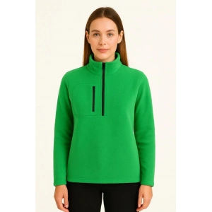 KADIN POLAR KAZAK – DİK YAKA, YARIM FERMUARLI, FERMUARLI GÖĞÜS CEPLİ, SİYAH BİYELİ, KIŞLIK RAHAT REGULAR FİT GÜNLÜK MODEL - YEŞİL