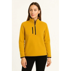 KADIN POLAR KAZAK – DİK YAKA, YARIM FERMUARLI, FERMUARLI GÖĞÜS CEPLİ, SİYAH BİYELİ, KIŞLIK RAHAT REGULAR FİT GÜNLÜK MODEL - SARI