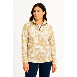KADIN YARIM FERMUARLI DESENLİ POLAR SWEAT YAKALI, UZUN KOLLU, OVERSİZE RAHAT KALIP - BEJ
