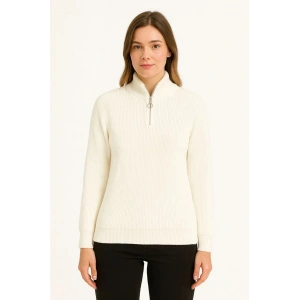 KADIN YARIM FERMUARLI TRİKO KAZAK – SELANİK ÖRGÜ, DİK YAKA, PAMUKLU DOKUMA, OVERSİZE UZUN KOLLU KIŞLIK MODEL - BEYAZ