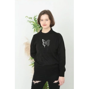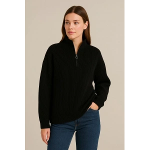 KADIN YARIM FERMUARLI TRİKO KAZAK – SELANİK ÖRGÜ, DİK YAKA, PAMUKLU DOKUMA, OVERSİZE UZUN KOLLU KIŞLIK MODEL - SİYAH