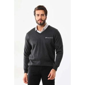 Baskılı V Yaka Uzun Kol Dokuma Triko - Füme