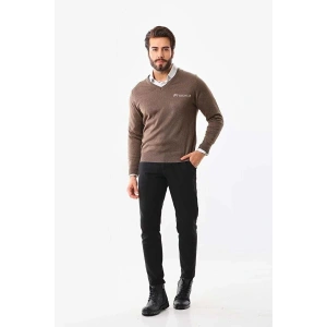 Baskılı V Yaka Uzun Kol Dokuma Triko - Kahve