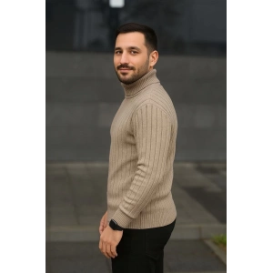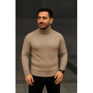 Erkek Balıkcı Yaka Bağazlı Triko Kazak Pamuklu Kalın Fitilli Dokuma, Regular Fit Uzun Kollu Kışlık Model - Bej