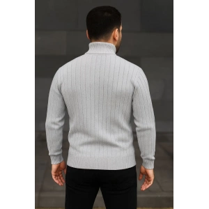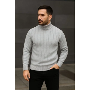 Erkek Balıkcı Yaka Bağazlı Triko Kazak Pamuklu Kalın Fitilli Dokuma, Regular Fit Uzun Kollu Kışlık Model - Gri