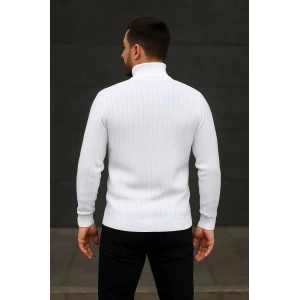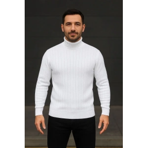 Erkek Balıkcı Yaka Bağazlı Triko Kazak Pamuklu Kalın Fitilli Dokuma, Regular Fit Uzun Kollu Kışlık Model - Beyaz