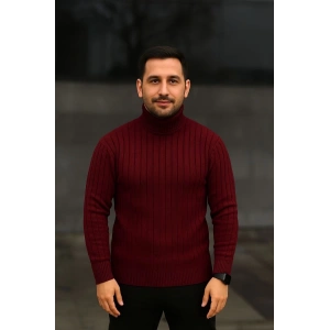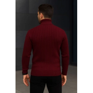 Erkek Balıkcı Yaka Bağazlı Triko Kazak Pamuklu Kalın Fitilli Dokuma, Regular Fit Uzun Kollu Kışlık Model - Bordo