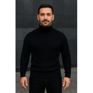 Erkek Balıkcı Yaka Bağazlı Triko Kazak Pamuklu Kalın Fitilli Dokuma, Regular Fit Uzun Kollu Kışlık Model - Siyah