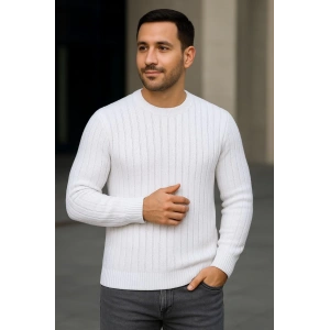 Erkek Bisiklet Yuvarlak Yaka Triko Kazak Pamuklu Kalın Fitilli Dokuma, Regular Fit Uzun Kollu Kışlık Model - Beyaz