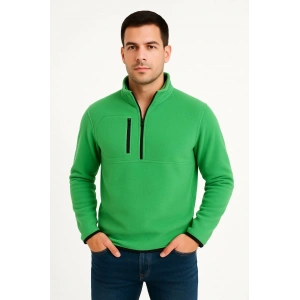 Erkek Polar Kazak – Dik Yaka, Yarım Fermuarlı, Fermuarlı Göğüs Cepli, Siyah Biyeli, Kışlık Rahat Regular Fit Günlük Model - Yeşil