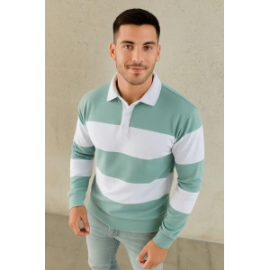Erkek Polo Yaka Uzun Kollu Çizgili Sweatshirt Trend Rugby Stil - Mint Yeşili