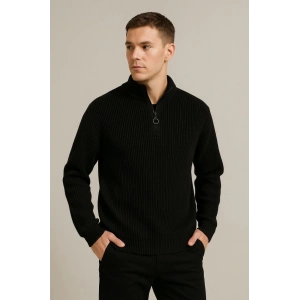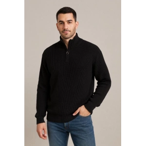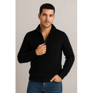 Erkek Yarım Fermuarlı Triko Kazak – Selanik Örgü, Dik Yaka, Pamuklu Dokuma, Regular Fit Uzun Kollu Kışlık Model - Siyah