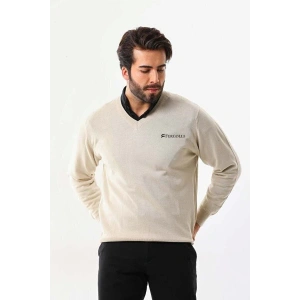 Baskılı V Yaka Uzun Kol Dokuma Triko - Bej