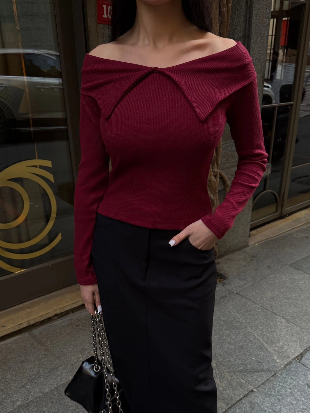 Fitilli Bisiklet Yaka İkili Bluz bordo T4341