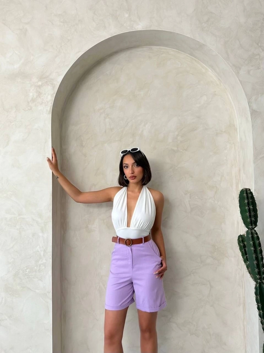 İki düğmeli kaz ayağı desen ch kumaş şort etek beyazturuncu h26414