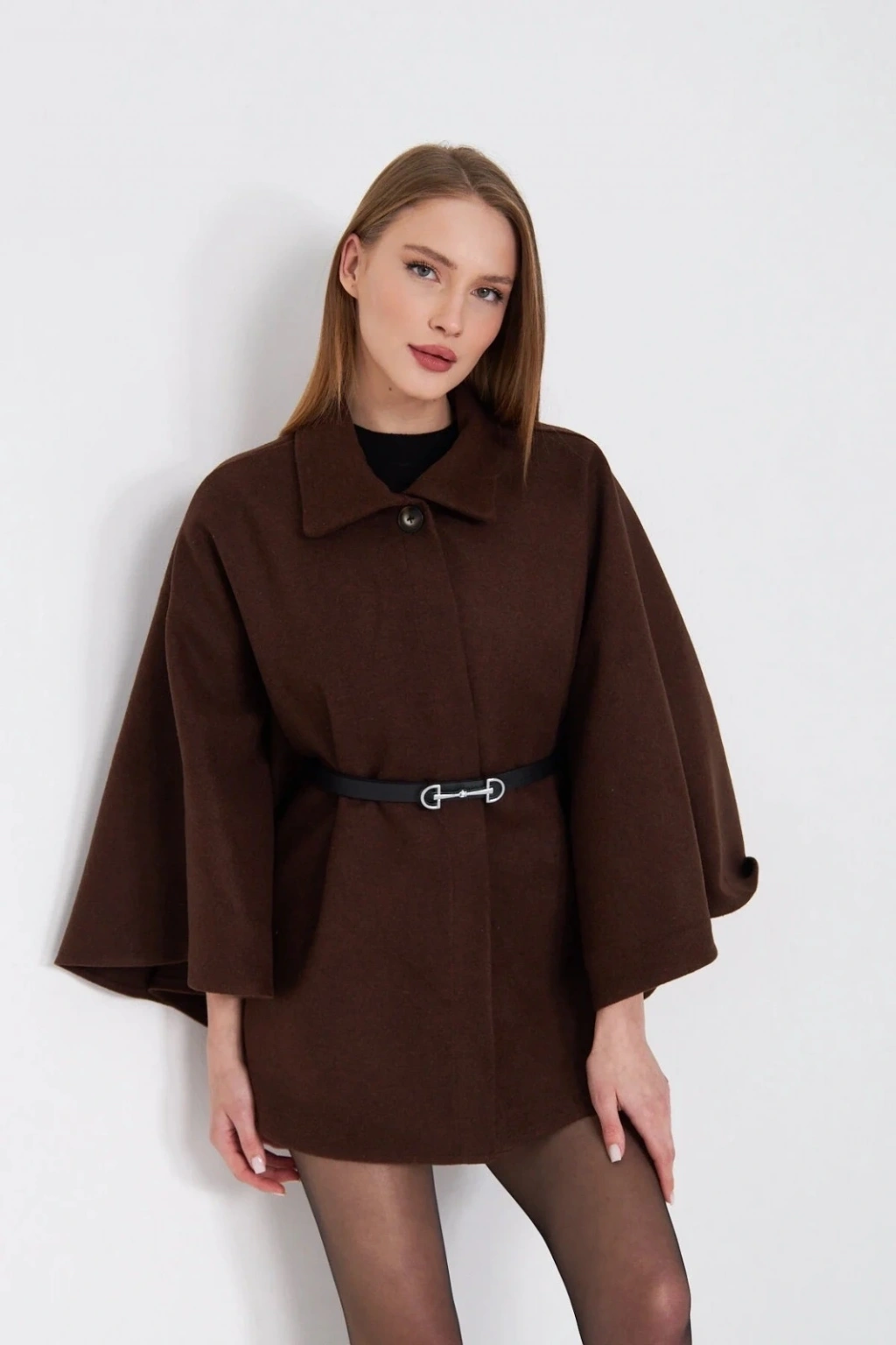 Kahve rengi kemerli kaşe panço şıklık ve rahatlığı bir arada sunuyor. Soğuk havalarda sıcacık tutarken, şık tasarımıyla her kombini tamamlıyor.